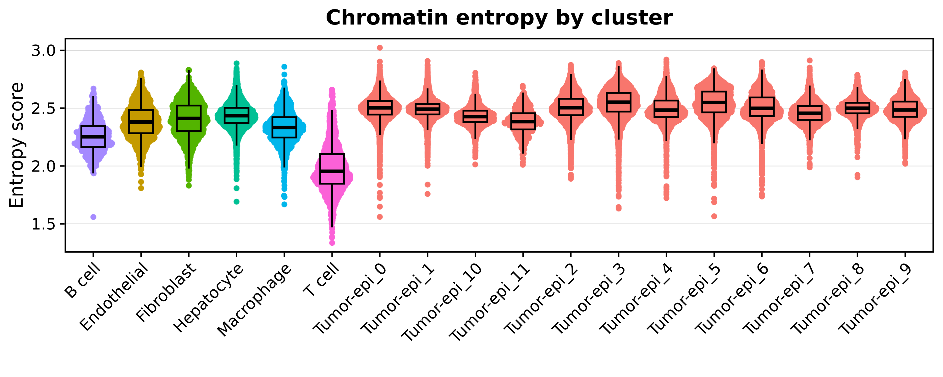 xlab('') + ylab("Entropy score") + ggtitle("Chromatin entropy by cluster")